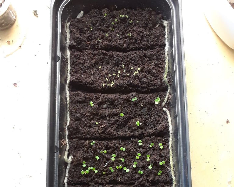How to Sow Those Tiny, Dust-Like Seeds: Hold the seed packet with one hand, half-open, with the seeds in the fold. Gently tap this hand with your other hand while moving it over the soil to distribute the seeds in a controlled way. You don’t want them all in one spot—it will be quite challenging to separate the seedlings later. Cover the tray with a transparent cover (plastic lid, Saran wrap, or place it inside another transparent container).